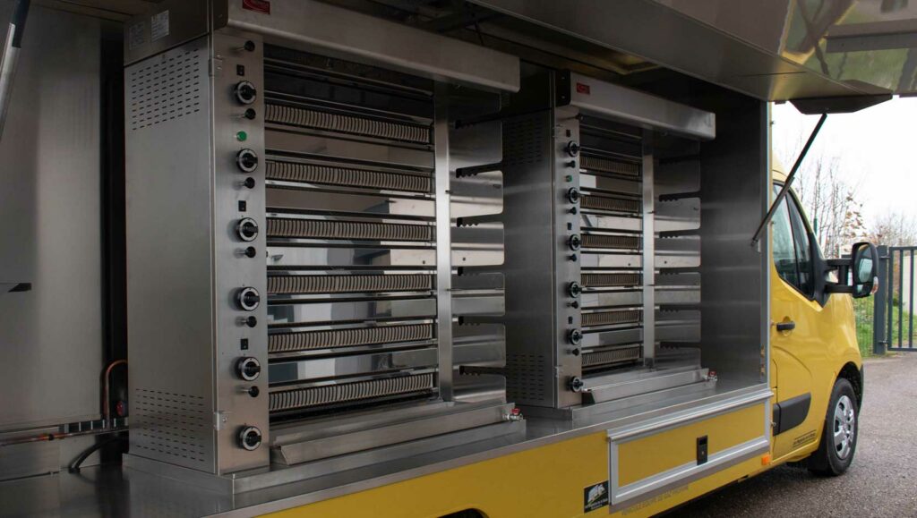 - L’agencement intérieur du camion est pensé pour optimiser la productivité : un espace de travail ergonomique, avec chambre froide, plan de travail inox pour l’embrochage, rôtissoires toutes marques au choix, etc. Résultat, vous perdez moins de temps en préparation, vous traitez plus de commandes, ce qui vous permet de gagner davantage.